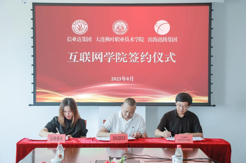 为深化产教融合,创新人才培育模式,赋能学院高质量发展,8月17日大连枫叶职业技术学院、信扬盛业国际教育控股(大连)有限公司与天津滨海迅腾科技集团有限公司签约,在信业达中日产教融合教育基地合作共建大连枫叶职业技术学院互联网学院暨迅腾产业学院。