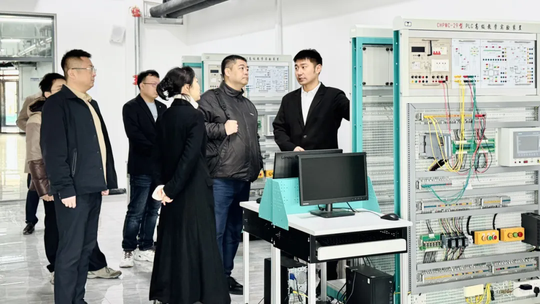 副总裁吴秋实一行首先前往智能装备与信息系、智能互联网产业学院进行实地参观,详细了解了设备配置情况,尤其对智慧黑板等各类现代化教学设备予以重点关注。参观过程中,副总裁吴秋实一行对学院在教学建设方面展现出的前瞻性与先进性给予了高度评价。