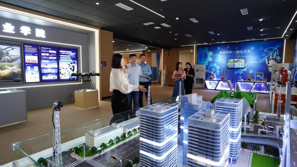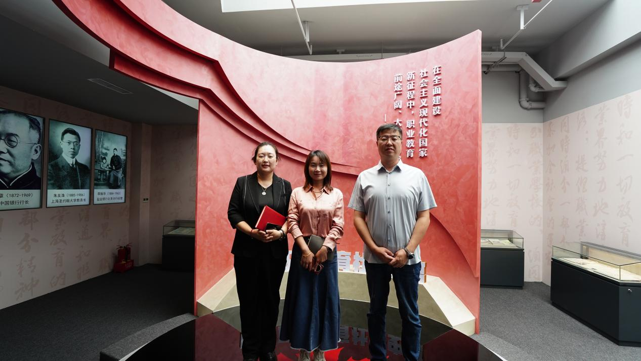 随后,众人依次参观我校AI教学设备展厅、中华职业教育社社史馆与碳中和•绿创未来展厅。AI教学设备展厅内,前沿技术与教学场景的深度融合,彰显了学院在教育数字化转型中的积极探索;社史馆中,历史与现代AI技术的融合,使得一幅幅历史图片、一段段文字记录生动起来,让大家沉浸式感受职业教育的发展脉络与使命担当;碳中和展厅里,新能源应用案例与环保实践成果,体现了学院响应国家“双碳”战略、培养绿色发展人才的责任与行动。