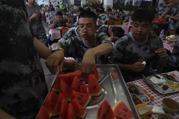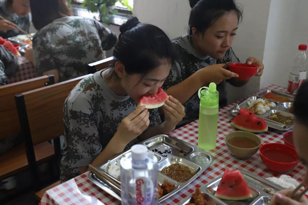 似曾相识的食堂,不过今天加餐,新鲜的西瓜让同学们大快朵颐。