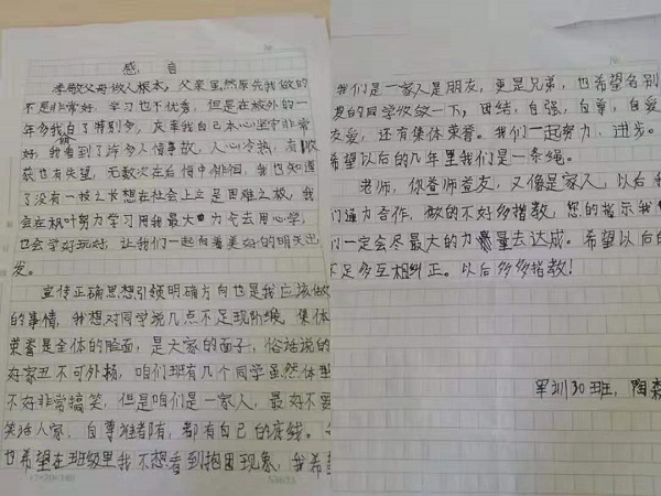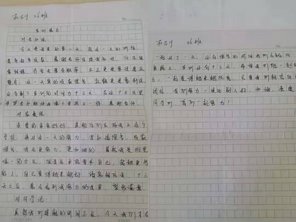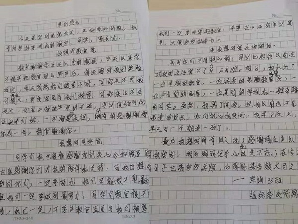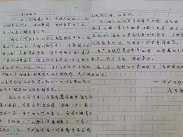 爸爸妈妈,其实你们不用担心我,军训比起我以前的武校生活算不了什么困难。相反,我认识了以为有趣的教官、温柔的导员、帅气的助导、美丽的学姐和一群有趣的同学。虽然,我黑了很多,但我以前也不白,亲爱的爸爸妈妈,你们放心我很好,我早已长大,早就可以独当一面。最后,我想对所有人说:感谢诸位对我所有好,在今后的日子里也请多多关照,我们相互进步、相互学习。