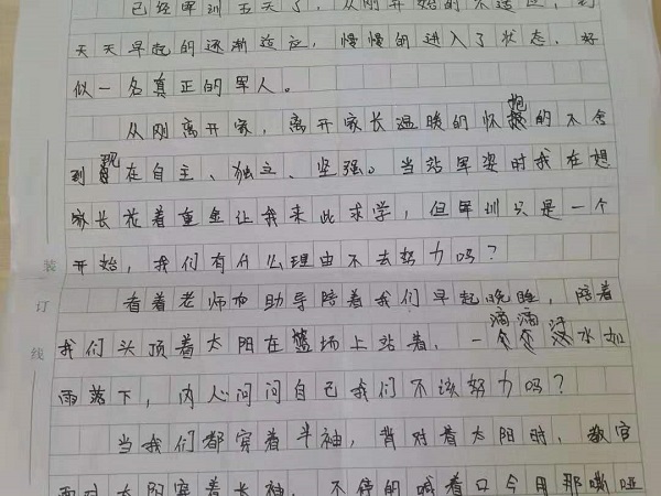 已经军训五天了,从刚开始的不适应,到每天过得充实,使我慢慢的进入了状态,好似一名真正的军人。从刚离开家,离开家长温暖的怀抱到现在自主、独立、坚强。当站军姿时我在想家长花着重金让我来此求学,但军训只是一个开始,我们有什么理由不去努力吗?看着老师和助导陪着我们早起晚睡,陪着我们头顶着太阳在篮球场上站着,一滴滴汗水如雨落下,我就告诉我自己,我更应该好好努力!