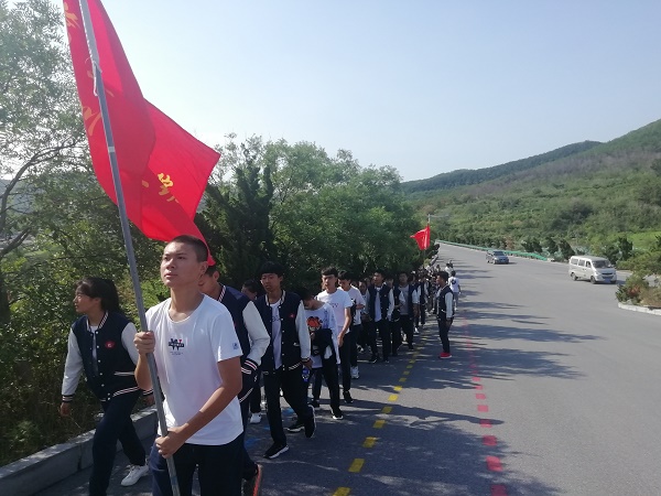 前后各一名教官维持秩序,保证了拉练过程中的安全。随着一声号令“出发”,学生们在老师和教官的带领下,排着整齐的队列开始从学校开始向观音山出发。中职部系旗和各班级的彩旗迎风飘扬,几公里的路程虽然不长,但同学们顶着烈日也并不轻松。为了提升大家的信心,同学们在教官的命令下开始喊起口号,唱响军歌,嘹亮威武的声音伴着队伍前进。