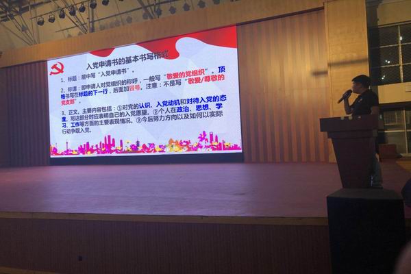 隋书记结合中国共产党党史、现状以及发展学生党员的各项规定,通过幻灯片、书面稿件等形式,分别从党情介绍、党员标准,入党流程、入党动机等方面为新生做了全面讲解。让刚入学的新生正确认识到入党对自身的要求,大大的提高了同学们对党的认识,端正了态度,树立了正确的入党动机。