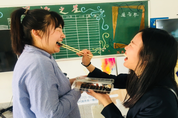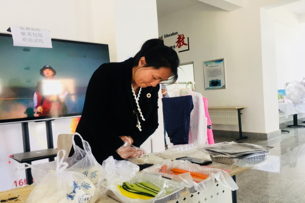 我院旅游专业教师郝佳品尝紫菜包饭