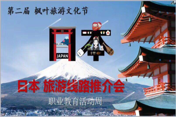 为培养学生旅行社业务的实际操作能力,巩固及提高学生专业技能,检验学习成果,同时丰富我校师生业余文化生活,2018年5月11日,我校旅游管理专业召开职业教育周活动。本次职业教育周活动以旅游文化节形式展示,召开我校第二届旅游文化节暨日本旅游线路推介会。