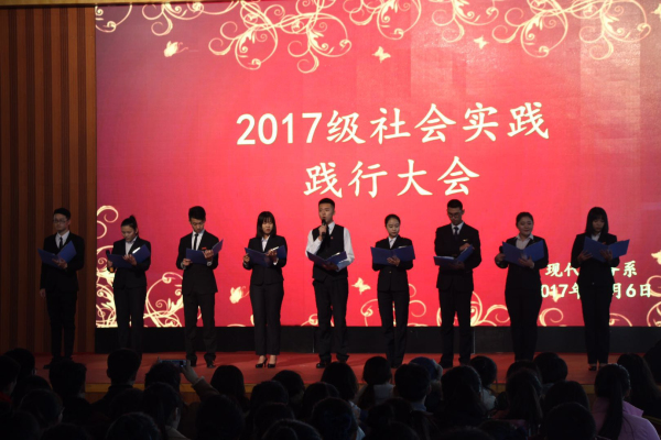 大会前16级助理辅导员通过视频的形式为17级学弟学妹们送来了他们最真挚的祝福。接着由现代服务系九大专业学生代表以朗诵送的方式诠释了社会实践的意义,随后17邮轮2班和17老服班两位主持人宣布大会开始,大会第一项全体辅导员登台,他们一一提出了在实践中会遇到的问题及解决问题的方法,同时作为老师代表着全体同学的家长给予所有同学带来嘱托和希望。大会第二项由17人力班杨玉双同学代表全体同学发言,他感谢学校提供此次社会实践的锻炼自我、磨练自我的机会,并且保证能够顺利的完成实践活动。大会上很荣幸邀请到系主任于庆霞和学生管理主任闫博,两位主任再次强调了上海社会实践的意义,嘱托所有同学在实践中一定要注意自己的人身安全,同时也祝福所有同学在实践中锻炼着、收获着、成长着,进步着。