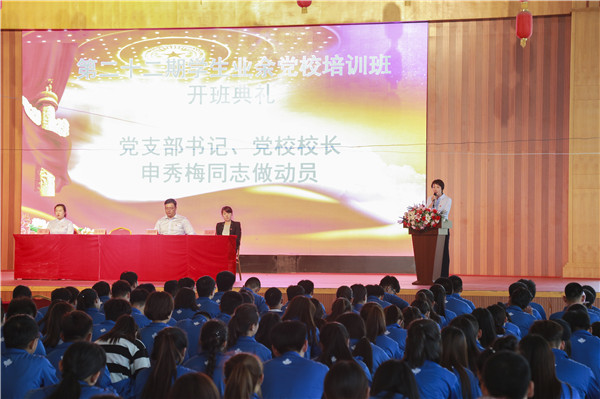 申秀梅代表学校党支部做动员讲话,她说到:“今天,当你们走进这个课堂,就意味着你们已经作出了一个正确的选择。你们在确立世界观、树立理想、选择人生道路的关键时刻,作出了学习中国共产党的基本知识、追求进步、争取入党的重大选择。这就意味着你们选择了无私奉献和全心全意为人民服务,选择了跟党走,肩负起实现中华民族伟大复兴的历史使命,选择了信仰共产主义,为实现人类最伟大的理想——共产主义而奋斗终身!”