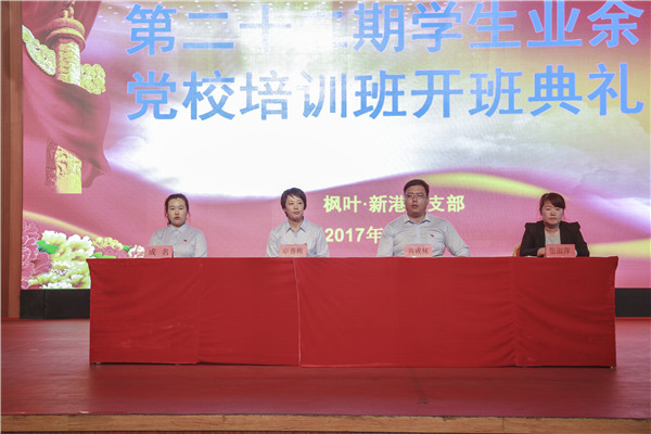 2017年5月19日,枫叶新港党支部第二十二期业余党校开班典礼在综合馆举行。党支部书记、党校校长申秀梅,党校教务主任、学生处长高成林,校团委书记成名,政体部主任张淑萍出席开班典礼,典礼由支部组织委员、党办主任聂俭丽主持。