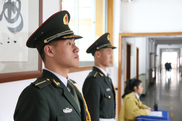 早晨七点钟的校园梨花桃花盛开、小草碧绿、空气清新。校园内彩旗、标语迎风招展与勤劳的枫叶师生构成一幅温馨、和谐的校园主旋律。学院正门架起的“欢迎各位同学与家长”“预祝同学们取得好成绩”大红拱门格外引人注目。大气的育人情怀,热情接待的服务团队,礼仪接待窗口都已进入紧张而又有序的工作状态。