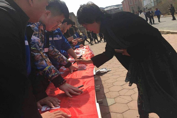4月10日11点20分,孙永海老师带领纪检部全体成员步行前往食堂正门进行校园禁烟宣传活动,布置本次活动所需条幅、展板等道具。首先,“本次活动负责人”向同学们宣传吸烟的危害性、戒烟的重要性和一些相关的禁烟小知识,并且给来往的同学们发放签字笔让同学们在禁烟横幅上签上自己的名字,倡导同学们“远离烟草,珍爱生命”,并发放礼品。活动开始后,大连枫叶职业技术学院执行院长申秀梅、学生处处长高成林等学校领导首先在横幅上留下了自己的名字以展现对本次活动的支持。随后枫叶学子们都积极参加了我们的禁烟宣传活动,纷纷的签下了自己的名字,众多的同学们在这短短的一个多小时内,传递了健康的声音,也播种了控烟禁烟的希望。