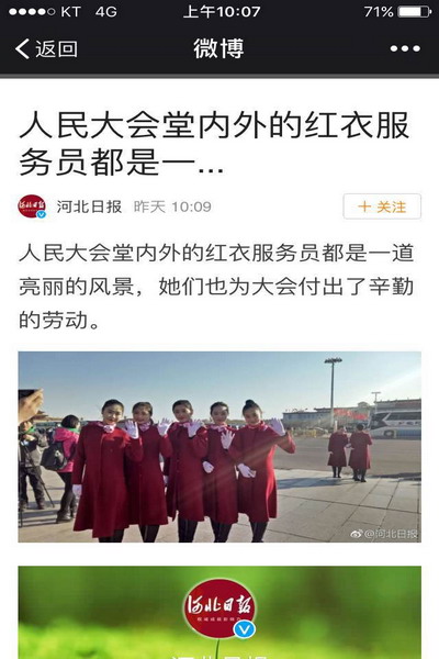 3月5日,全国“两会”正式召开,我院空中乘务专业的学生,以其良好的形象和优秀的职业素养现身“两会”,靓丽耀眼,她们分别负责山东代表、陕西代表团、云南代表团、主席团的接待工作。当日,河北日报官方微博发布我院红衣女孩服务“两会”照片,充分展示我院学生风采。正所谓,当春时节,红衣在首都闪亮,枫叶在首都耀眼!