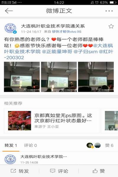 感谢您的关怀,感谢您的帮助,感谢您为我做的一切……请接受我的祝愿,祝您健康幸福。感恩月,你感恩了吗?大连枫叶职业技术学院通关系为提高同学们的个人修养、提升同学们的思想道德素质,决定于2016年11月开展一系列感恩月活动。