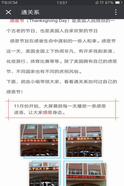 通关系宣传部自月初始搜集感恩素材,为激励所有师生心怀感恩,通关楼外的宣传滚屏每天一句感恩暖心的话语提醒我们心怀感恩;通关楼内也有很多的感动人物,他们是课上教学的教师;是走廊洁净的保洁阿姨;是保护我们安全的保安叔叔;也是维修仪器用具的暖心叔叔……他们是身边人,感动我们身边事。不仅是部门在积极活动,每个班级也都在班级进行进一步的宣传,包括班级的板报以及各班的微博建设等等。感恩节当日,通关系青年志愿者协会承办的献血活动拉开帷幕,同学们纷纷前来献血聊表爱心,他们又何尝不是该被感恩的对象呢?除此之外,各班的代表也准备了祝福的话语,并制作成视频,打算在感恩节当天,送给所有他们想要感恩的人。