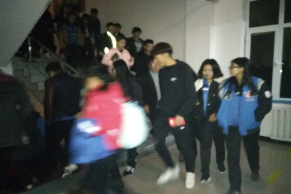 晚上1930分,同学们正在教室里上自习,突然,刺耳的消防警报声瞬间在各楼层响起,各楼层值班老师立即下达“消防警报,各班级迅速组织逃生”口令,听到指令后,各楼层、各班级班长、安全员迅速组织本班同学进行有序疏散,疏散途中提醒同学们要用衣袖捂住口鼻,右侧通行,快速逃离现场。演练从拉响消防警报信号开始,到所有同学全部撤离完毕,分别用时2分46秒和3分05秒,所有同学从1号教学楼、2号全部安全撤离完毕,没有一人出现受伤、掉队的现象。