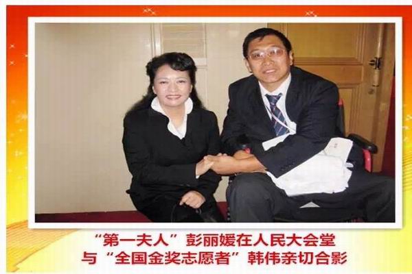 第一夫人在人民大会堂与金奖志愿者韩老师合影