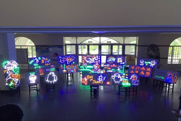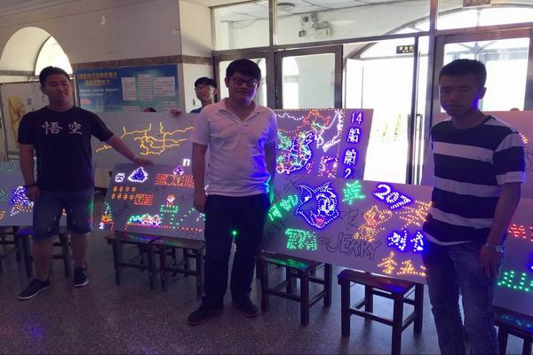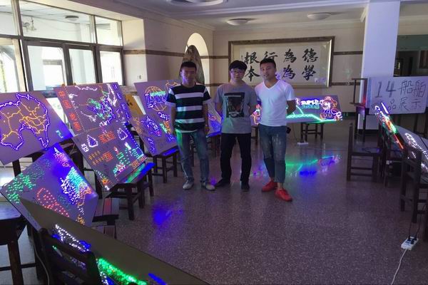 会展由于彬老师老师指导,经历了三个月的奋斗,利用10次电工课的时间,14级船舶专业学生终于在顶岗实习之前完成了这次专业作品展。从最开始的电路学习,接线学习,到对每一个 LED灯的效验,质量测量,都是一份辛苦活,一个展板可能要200-400个 LED灯,每个小灯泡都要保证可以正常使用,然后对不同颜色,不同电阻,不同闪光状态(例如:常亮,跑马灯等)的灯泡进行焊接,排线,一直到今天,每个作品能闪亮的展现出来都是一点一点的知识和经验堆积而成,每个展板的背后也都是学生一点点努力和汗水串起来的。