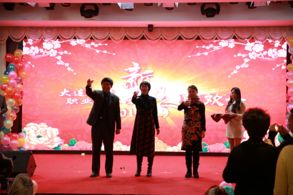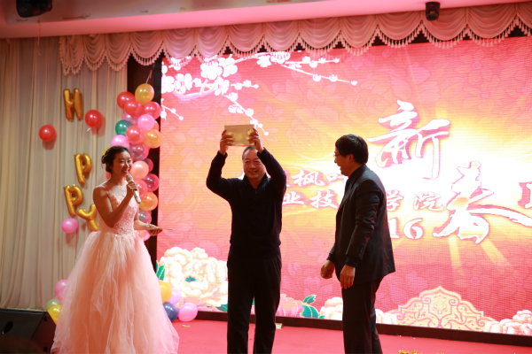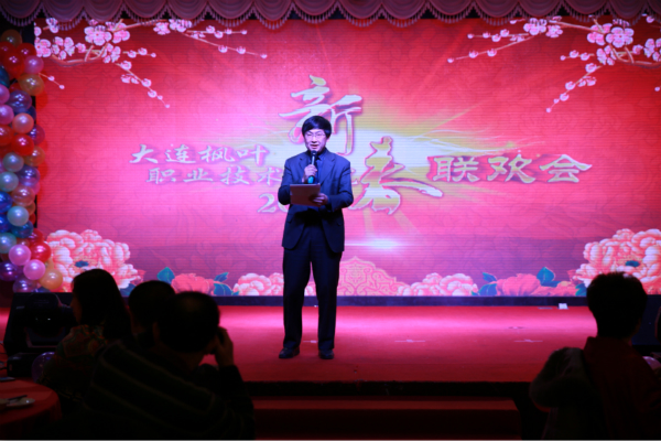 2015年12月31日中午,团山酒店流光溢彩,乐舞飞扬,弥漫着浓浓的节日氛围,大连枫叶职业技术学院以‘感恩有你,与梦想同行’为主题的新春联欢会隆重举办。学院领导和200多名教职工其乐融融地欢聚一堂,载歌载舞,同庆元旦,喜迎新年。