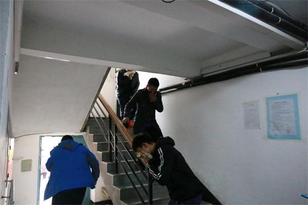演练前,通关系安全部认真细致的制定了此次演练活动方案,明确了职责要求,为演练的成功举行提供了切实的保障。通关系系办李东风老师和孙永海老师为本次消防演习的主要负责人,通关系安全部全程参与帮助同学们安全疏散。随着一阵急促的警报声,各协管老师立即到达指定位置疏散学生,在安全负责人的指导下开始了火场疏散逃生演练。同学们用毛巾捂住口鼻,低姿弯腰,沿着布满烟雾的楼道有序撤离。在不到5分钟时间里,全体师生安全疏散到了安全地带,随即各班清点人数,整个疏散逃生迅速而有序。