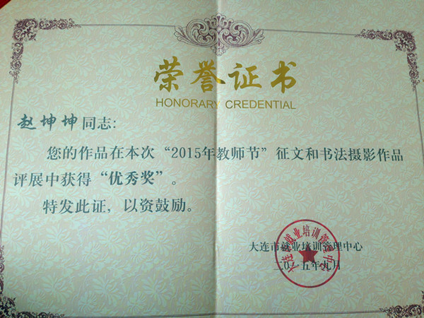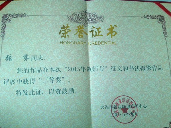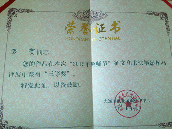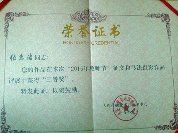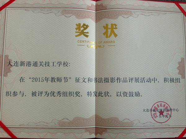 为庆祝“2015年教师节”,丰富全市技工教育和职业培训战线师生的业余生活,大连市就业培训管理中心和大连市职业培训协会党委结合 “爱国、爱党、爱教育”主题教育活动,在全市技工院校和市本级政府补贴就业技能培训定点机构范围内联合举办征文和书法、摄影作品评展活动,我校荣获优秀组织奖。 我校选送的师生作品在活动中喜获佳绩。