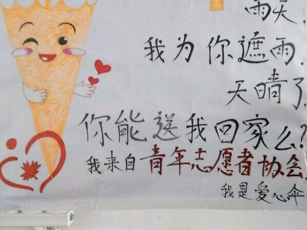 小小的雨伞遮挡的是风雨,传递的是爱心,撑开的是和谐。一把雨伞,承载着人性的光辉,他将爱心与爱心串连,将温暖在雨天传递。它不仅体现了人们对他人的奉献,更是将学院的正能量传递给学院得每一位。让大家生活的校园充满正义之风。