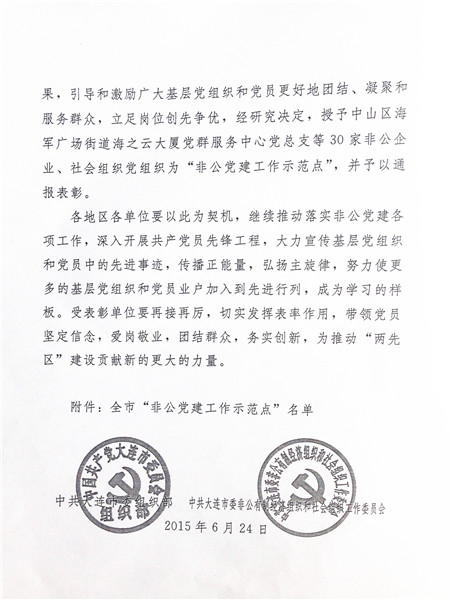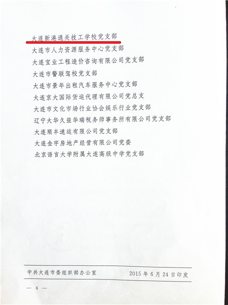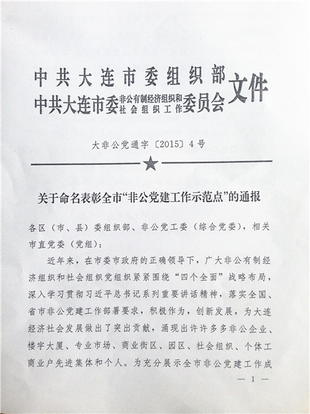 近日,经辽宁省大连市人力资源和社会保障局推荐,我校党支部被评为全市“非公党建工作示范点”,受到中共大连市委组织部、中共大连市非公有制经济组织和社会组织工作委员会的通报表彰并授牌。