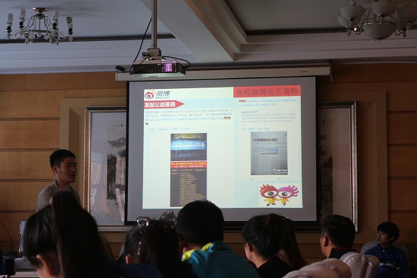 董自山经理与大家交流了自己在工作中总结的关于运用微博媒体积极探索高校团学工作的探索和思考,分析了高校微博应用现状、高校微博运营策略,结合生动应用案例分析演练,提出在运用新媒体开展工作要注意把握“四项原则”,即常态化、规范化、创新性和实效性;要坚持“一条底线”,即正确的政治方向,两个“先进性”,即内容的先进性、技术的先进性,做到“三贴近”,即贴近学生、贴近生活、贴近实际,并注意做到“四个结合”:“趋利”与“避害”、“监控”与“引导、“教育”和“服务”、“网上”与“网下”相结合,为全体与会人员上了一堂生动的新媒体育人现场指导课。