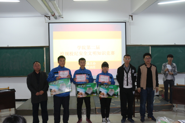这次竞赛是以校规校纪和安全文明知识我知多少为主要内容的竞技活动,赛程分必答题、抢答题、风险题三个环节,取团体第一、二名。参加这次竞赛的12名选手,都是由各系经过选拔脱颖而出的尖子选手,他们早已把校规校纪、安全文明知识牢记在心中,4组选手你来我往,分值交互领先,现场气氛被选手的出色表现所感染,观众答题环节,各系啦啦队争先举手抢着回答,台上台下遥相呼应你追我赶互不示弱。抢答环节比分交替上升扣人心弦,抢答比的是技能,拼的是心理,考验的是选手反应能力。三个环节过后,船舶与计算机系1队和通关系2队总分相同都是190分,按着赛程两个队进行了加时赛,又经过三轮抢答,最终船舶与计算机系1队技高一筹,获得了第一名,通关系2队获得了第二名,其余两个队获得了第三名。学生处和系办老师为取得荣誉的集体和个人颁发证书和奖品。