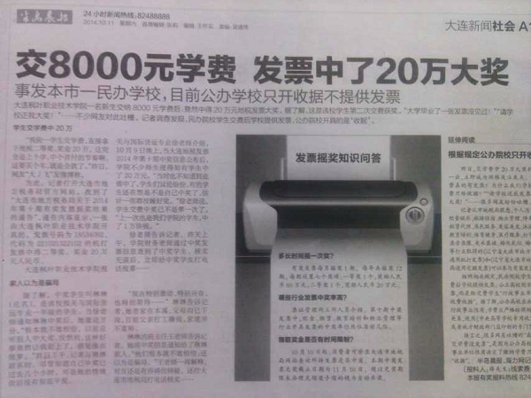 交学费还能中大奖!?你也觉得不可思议吗!近日,喜讯传来,经大连市地税2014年第十期有奖发票摇奖,我院通关系报关与国际货运专业一年级的学生缴纳学费所开发票喜中20万元大奖,这一消息一经传开,大家的目光和关注点由荧光海岸转到了枫叶校园,这次的中奖事件不仅仅是枫叶学子关注的对象,更是让枫叶校园闪耀在聚光灯下,下图为半岛晨报对我院进行报道。
