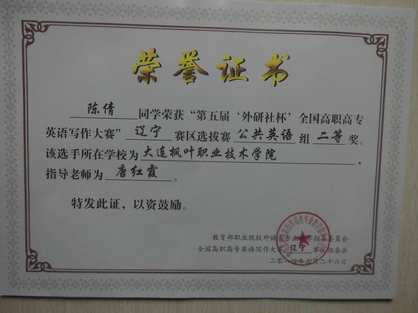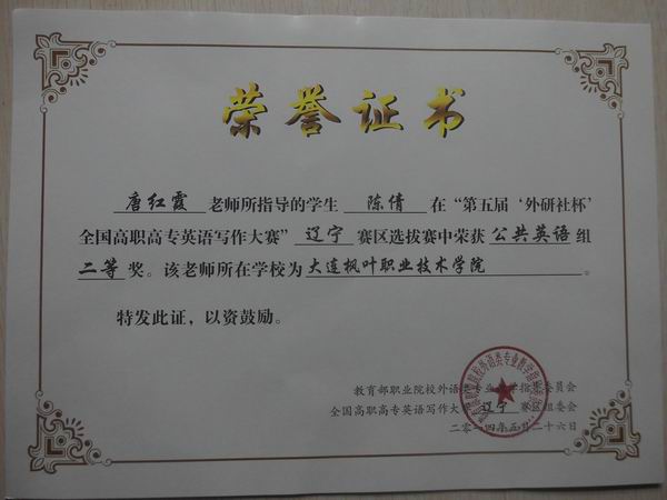 2014年5月11日,由辽宁省主办的高职高专英语写作大赛,在大连东软信息学院如期举行。本次参赛的有鞍山师范、辽宁机电、大连东软等省内十余所学校,由各高职院校选拔的40名选手参与角逐。我院唐红霞老师带领我院三名优秀学生参加此次比赛。