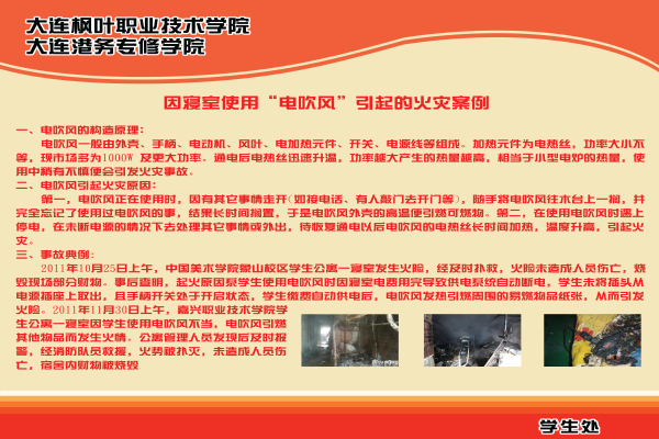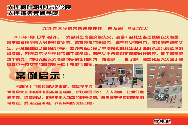 同学们可通过观看展板学习防火常识,增强自己的消防意识。宣传展板内容丰富,形式直观。包括2008年上海商学院、2011年中国美术学院、嘉兴职业技术学院以及今年的大连某所大学宿舍因使用违章电器引起大火等典型案例,也有消防灭火真实图像,集中展示了火灾的危害性,提醒大家要大力打击消防危害分子,注意生活中的消防常识,提高自我保护能力。
