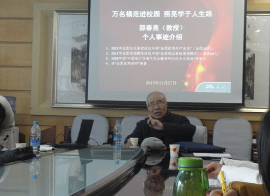 课堂上,邵老师结合自己50余年的教育经历和20多年的辅导员工作经历,用大量的、典型的人和事讲述了一个老教育工作者的育人情怀,与大家一起分享了他帮助学生成长过程中的喜与乐、苦与悲。邵老师用真情、用博爱、用责任、用坚持诠释了一位人民教师、一位共产党人的对学生的爱,对党的爱,对祖国的爱,课堂上邵老师3次动情落泪,感人至深,听课人员一边被洗礼,一边被感动。