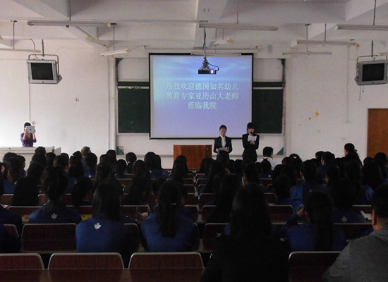 2013年10月10日,德国知名幼儿教育专家亚历山大老师应邀到我院为学前教育专业的同学们开展讲座。莅临本次讲座的领导有:大连华德福教育服务有限公司、爱之翼亲子俱乐部总经理辛亮女士,大连泰格海事服务有限公司经理王雪飞先生,大连枫叶职业技术学院院长申秀梅、教务处处长张淑萍、船舶与计算机系主任王晓琳以及幼师教研组的老师们。