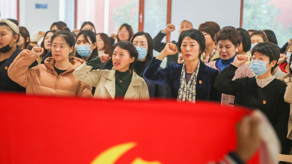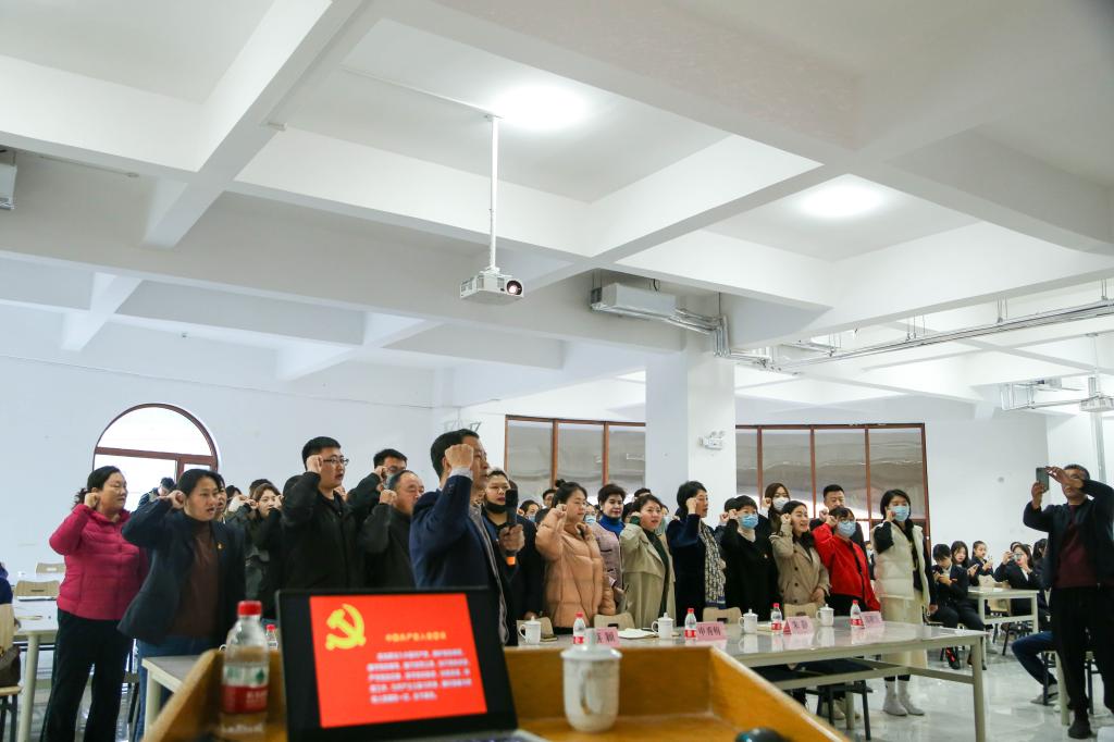 讲座临近尾声,滕君政老师组织在场全体党员重温入党誓词。在鲜红的党旗下,全体党员佩戴党徽,紧握右拳,庄严宣誓。铿锵誓言久久回荡,让现场所有党员更加坚定牢记自己的庄严承诺,时刻以党员的标准严格要求自己,以实际行动践行对党的庄严承诺。
