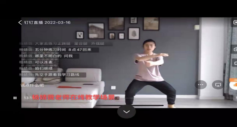 杨婧微老师《武术》课程,在线上授课过程中全身出镜,为班级同学演示武术动作,将武术动作详细分解,力争与学生零距离沟通,组织学生自主练习,学生积极反馈,通过这种线上互动的形式让学生“学在课堂,炼在自身”。
