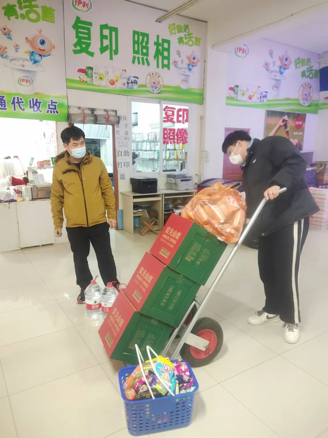 孙主任与杨海波老师在超市为同学们采购物资,进行派送,为同学们提供必需的物资保障,共同打好疫情防控后勤保障战。