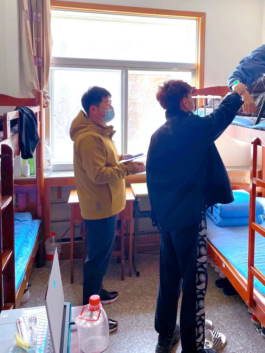 孙主任与学生干部每日早上走访寝室,为学生测量体温