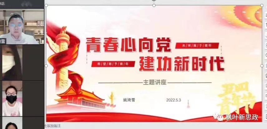 高举团旗跟党走,不负韶华献青春。学习党史明方向,全力奋进新征程。为庆祝中国共产主义青年团成立100周年,贯彻落实习近平总书记关于教育的重要论述,全面贯彻党的教育方针,落实立德树人根本任务,继续发扬历史主动精神,巩固党史学习教育成果,乘势而上,砥砺前行,以实际行动迎接党的二十大胜利召开!5月3日,思政部教师姚琦雪面向枫叶知行社、枫叶正红读书会、枫叶中职雷锋班的同学们开展了“青春心向党,建功新时代”线上讲座。