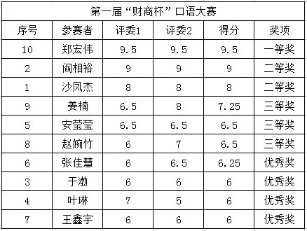 口语大赛设置个人单项奖,分设一等奖、二等奖、三等奖。10%一等奖、20%二等奖、30%三等奖、其余为优秀奖。评委老师们打分,核算,最终得分和名次如下所示: