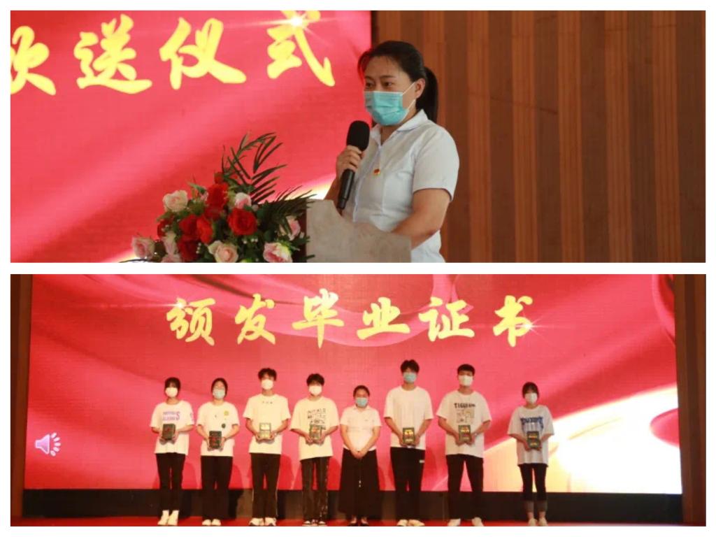 大连新港通关技工学校副校长徐凤龙宣读优秀毕业生决定并颁发证书。大连新港通关技工学校教学管理副主任裴莉琳宣读毕业生名单并颁发毕业生证书。