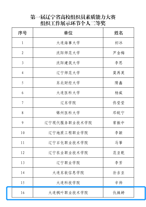 8月8日-9日,中共辽宁省教育工委、辽宁省教育厅主办的第一届“辽宁省高校组织员素质能力大赛”在辽宁财贸学院举办,我院选派仇姝婷、柴春颖、孙永欢三名组织员参加比赛。大赛共设初赛、复赛、决赛三个环节,设计有党务基础知识竞赛、组织工作展示、主题微党课、党务工作情景模拟四部分内容,经过激烈角逐,我校荣获优秀组织奖,仇姝婷同志在组织工作展示环节荣获个人二等奖。