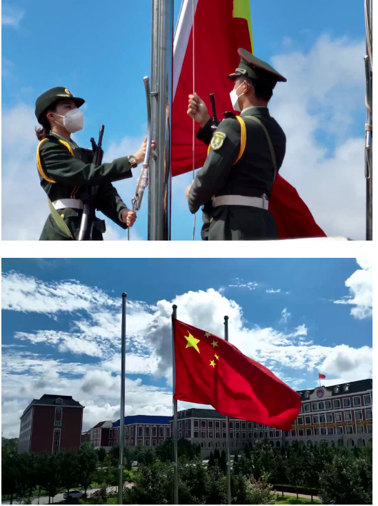 典礼在振奋人心的国歌声中正式拉开帷幕,无人机镜头划过学院上空,屏幕前的全体师生庄严肃穆、歌声嘹亮。