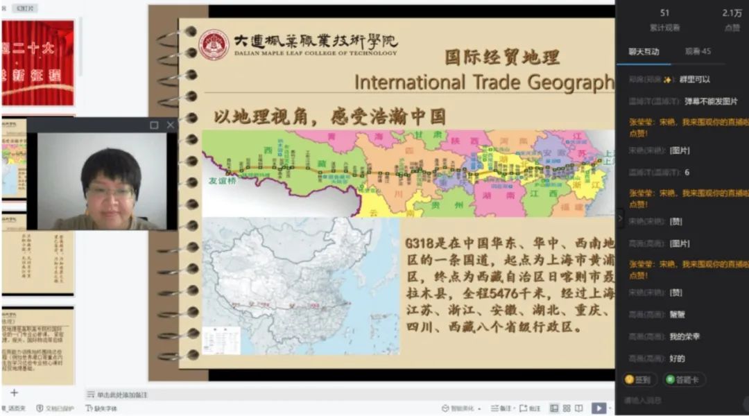 在国际商务专业《国际经贸地理》课程中,宋艳老师以<重复>“地理视角,感受浩瀚中国”为主题,将横贯中国华东、华中、西南地区的318国道为例,带领学生在上海、江苏、浙江、安徽、湖北、重庆、四川、西藏八个省级行政区间领略中国近百年的巨大变化,坚定学生们为实现中华民族伟大复兴的中国梦而努力奋斗的理想信念。