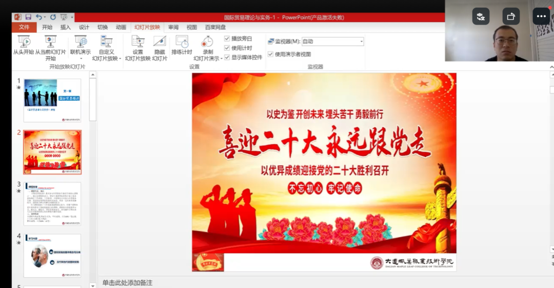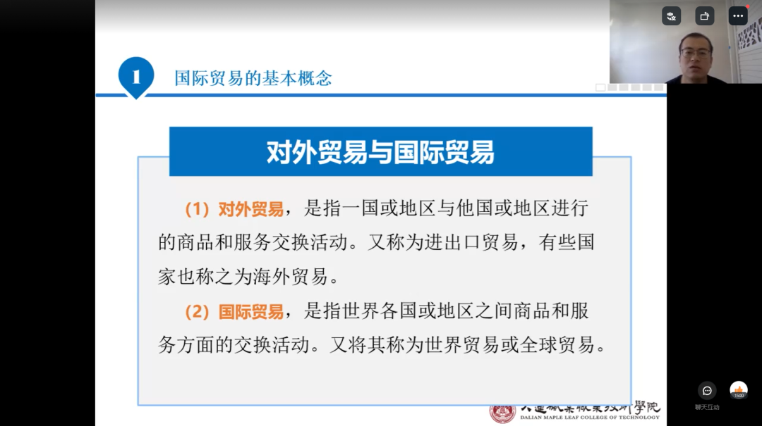 刘景琳老师的课程以“喜迎二十大,永远跟党走”思政内容为核心,课上,他带领同学们共同回顾我国发展史;并以时间轴作为主线,引导学生展开头脑风暴,共同回顾国际贸易的发展史,明确国际贸易的含义、特点等知识点,课堂活跃生动。