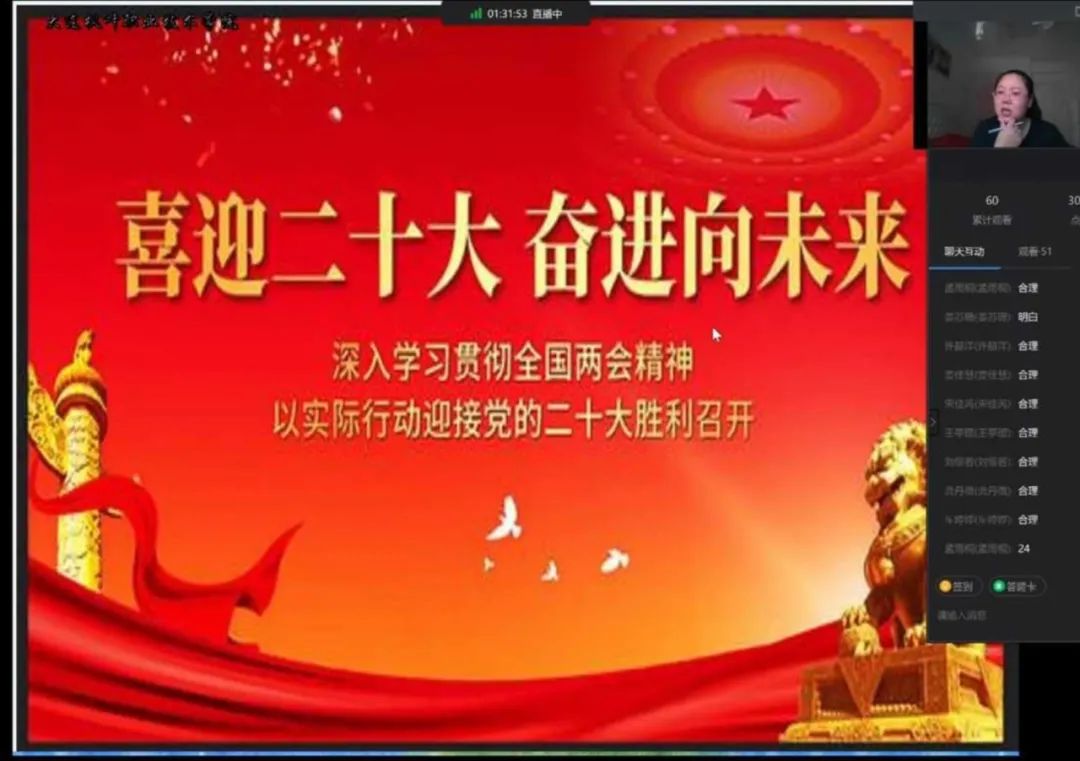 刘影老师在课上通过带领学生们深入学习两会精神,同时结合会计相关岗位深入介绍了会计岗位的职业发展方向及所需要具备的职业道德,融入暑期辽宁省职业院校教师培训中的爱国主义教育内容,带领学生们深入学习中国共产党百年奋斗的光辉历程。