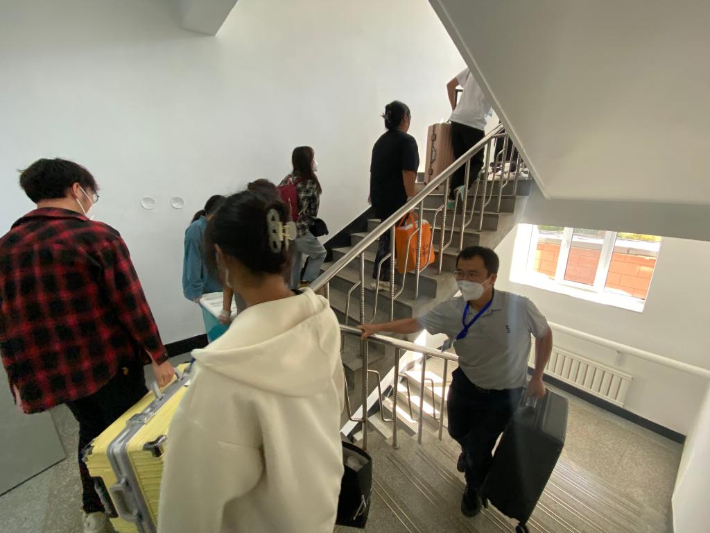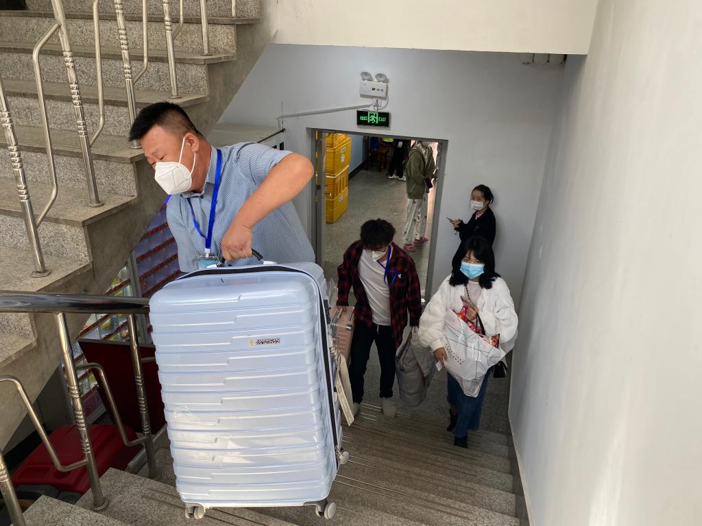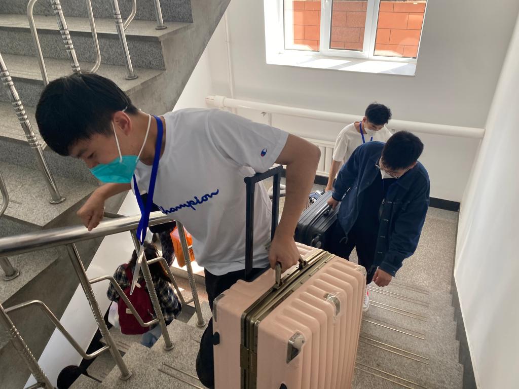 从学生手中接过的行李箱