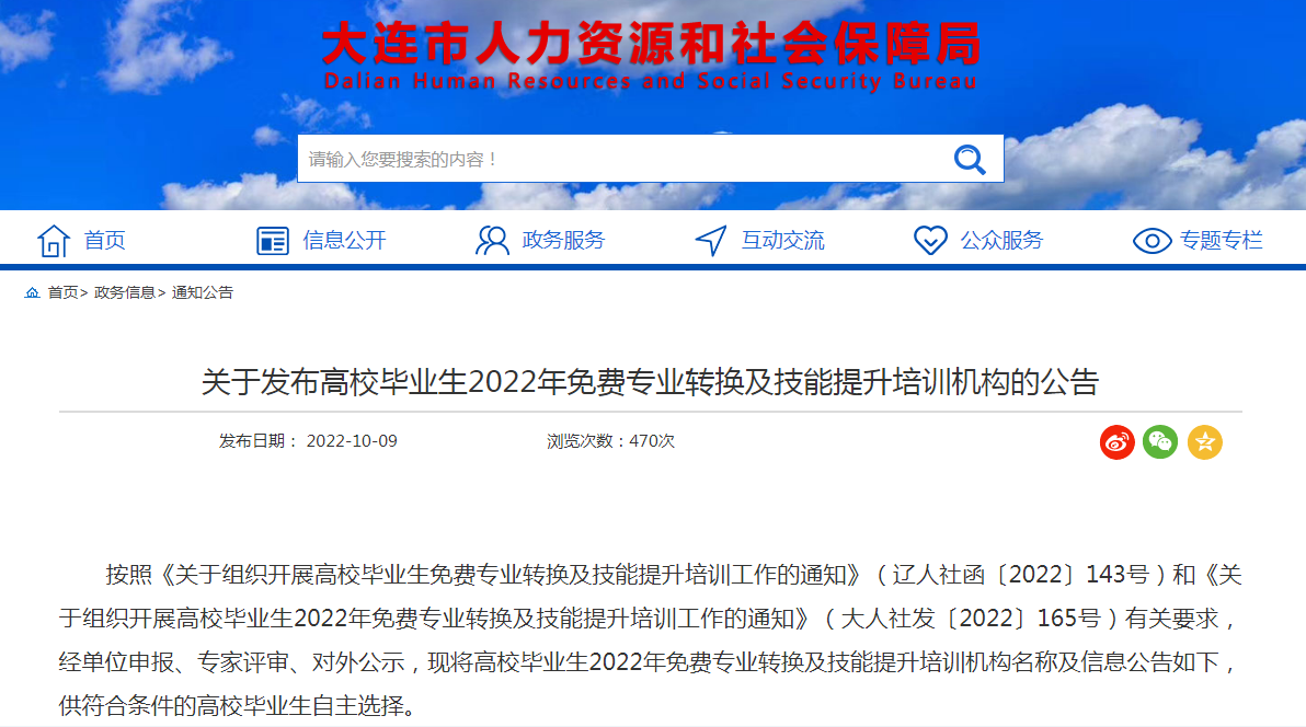 按照《关于组织开展高校毕业生2022年免费专业转换及技能提升培训工作的通知》(辽人社函〔2022〕143号)和《关于组织开展高校毕业生2022年免费专业转换及技能提升培训工作的通知》(大人社发〔2022〕165号)有关要求,经单位申报,专家评审、对外公示。大连市15所机构被批准为高校毕业生2022年免费专业转换及技能提升培训机构。