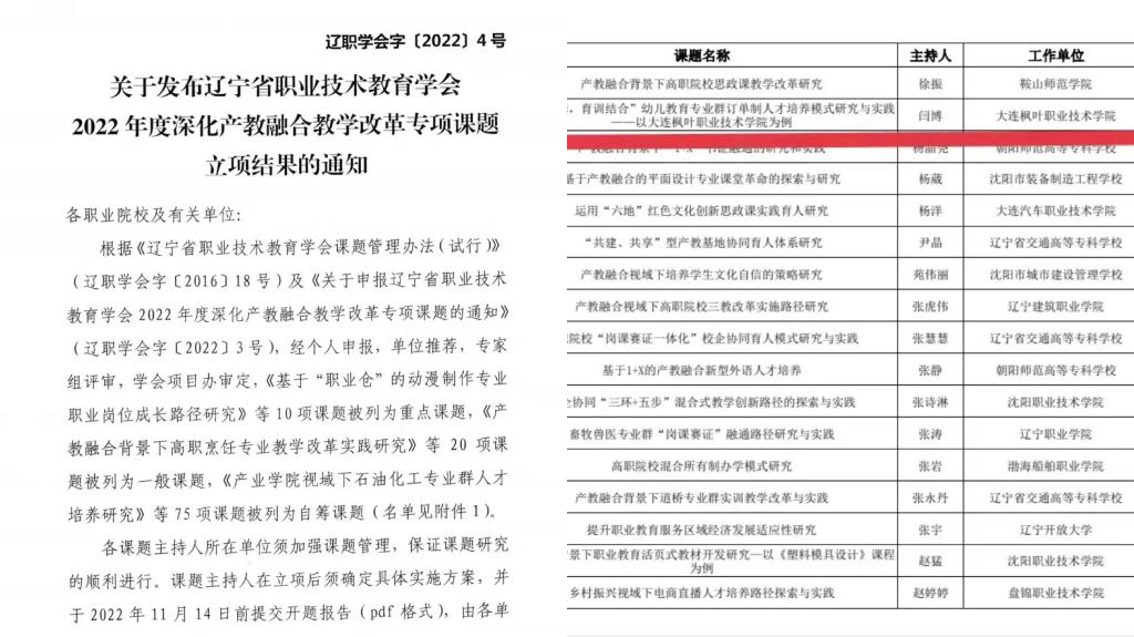 10月10日,辽宁省职业技术教育学会发布了2022年度深化产教融合教学改革专项课题的立项结果通知。根据《辽宁省职业技术教育学会课题管理办法(试行)》,结合专家评审意见,经个人申报,学院高教研究室推荐,专家组评审,学会项目办审定,大连枫叶职业技术学院现代服务系党支部书记、系主任闫博与幼师专业团队选题《“德技并修,育训结合”幼儿管理专业群订单制人才培养模式研究与实践——以大连枫叶职业技术学院为例》成功立项。