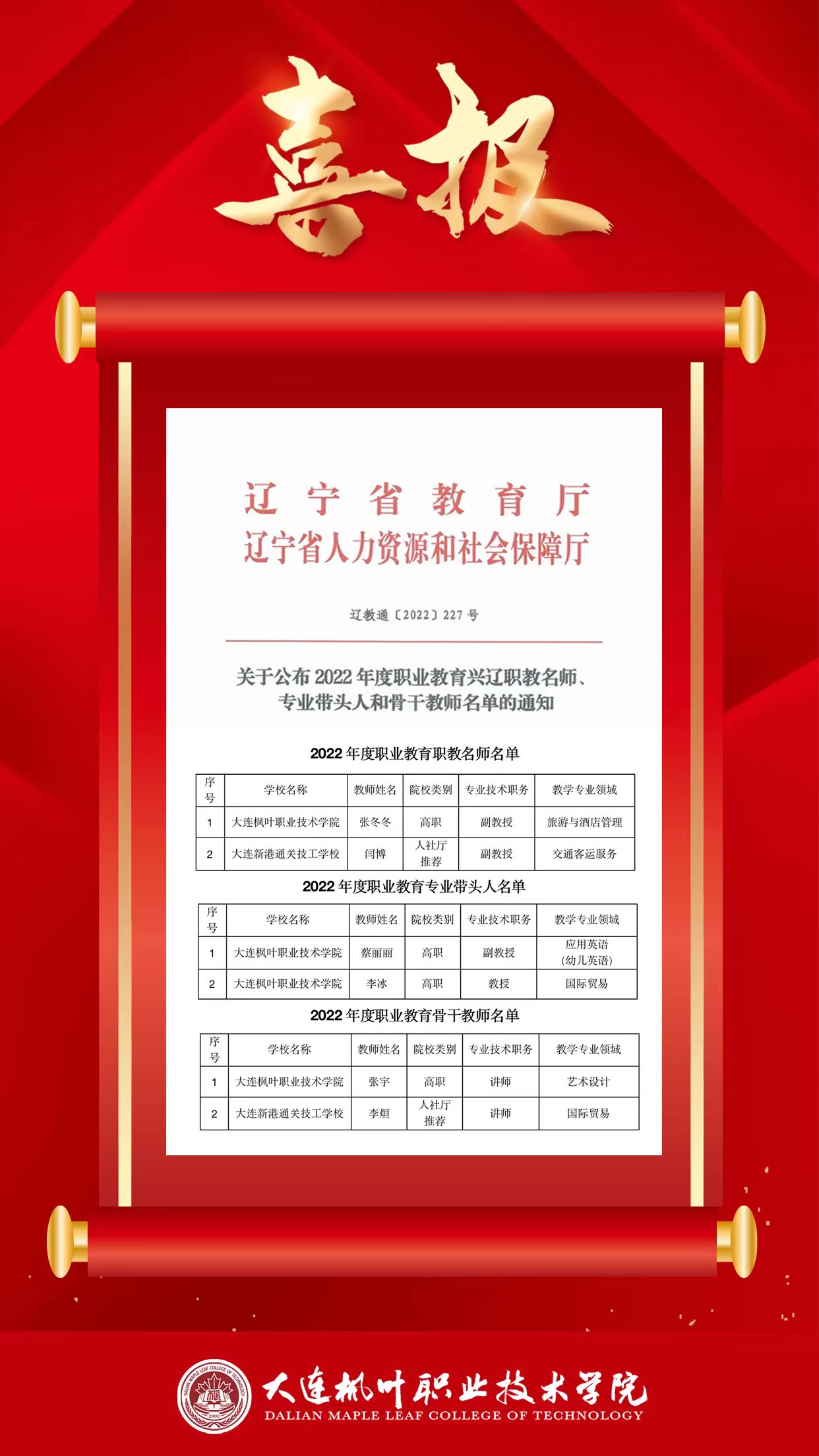 近日,辽宁省教育厅、辽宁省人力资源和社会保障厅公布了《关于公布2022年度职业教育兴辽职教名师、专业带头人和骨干教师名单的通知》文件,我院教师张冬冬、闫博荣获2022年度职业教育职教名师称号,蔡丽丽、李冰荣获2022年度职业教育专业带头人称号,张宇、李烜荣获2022年度职业教育骨干教师称号。