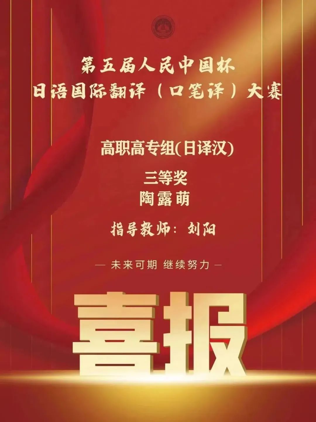 “人民中国杯”日语国际翻译大赛规模宏大,专业性强,认可度高,此次比赛极大地调动了我院外语爱好者和学习者的参赛热情,秉着“以赛促教,以赛促学”的理念,今后我院将继续组织学生积极参与此类大赛,帮助学生们以行动践行“勤学精技,尚德利他”的校训精神,不忘初心,砥砺前行。